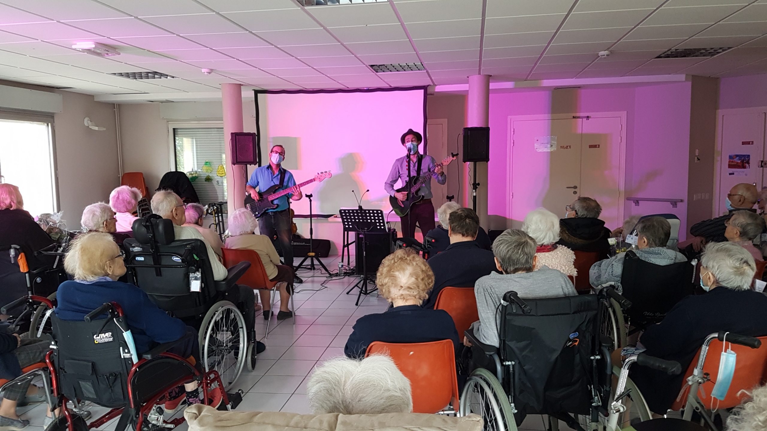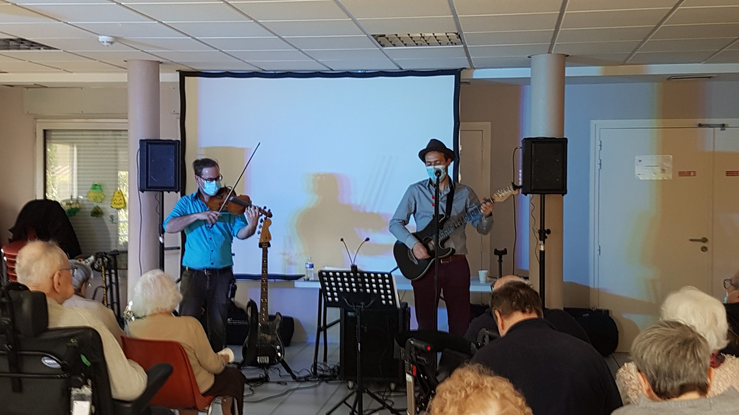 Ce début de mois d’avril, nous avons donc fêté les anniversaires des mois de Janvier, Février et Mars avec un duo de musiciens talentueux, « Pierre et Chausson ». Guitare et Violon ont rythmé l’après-midi très apprécié par les résidents venus nombreux profiter de cet évènement festif.