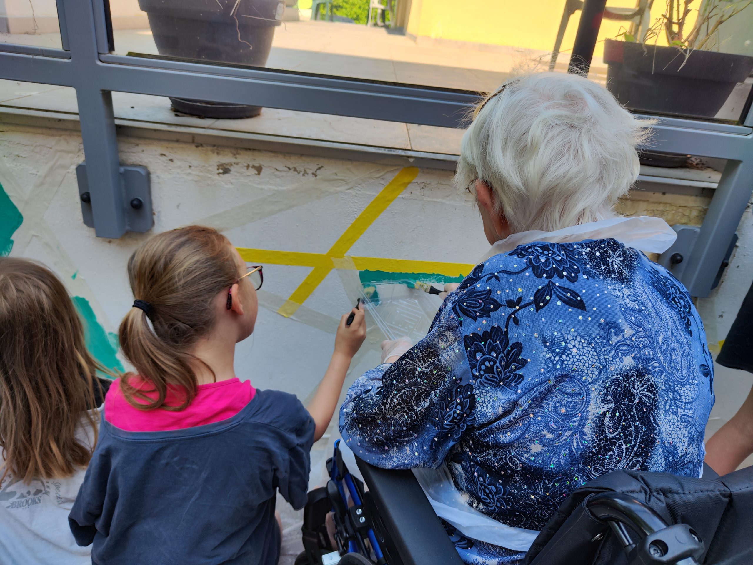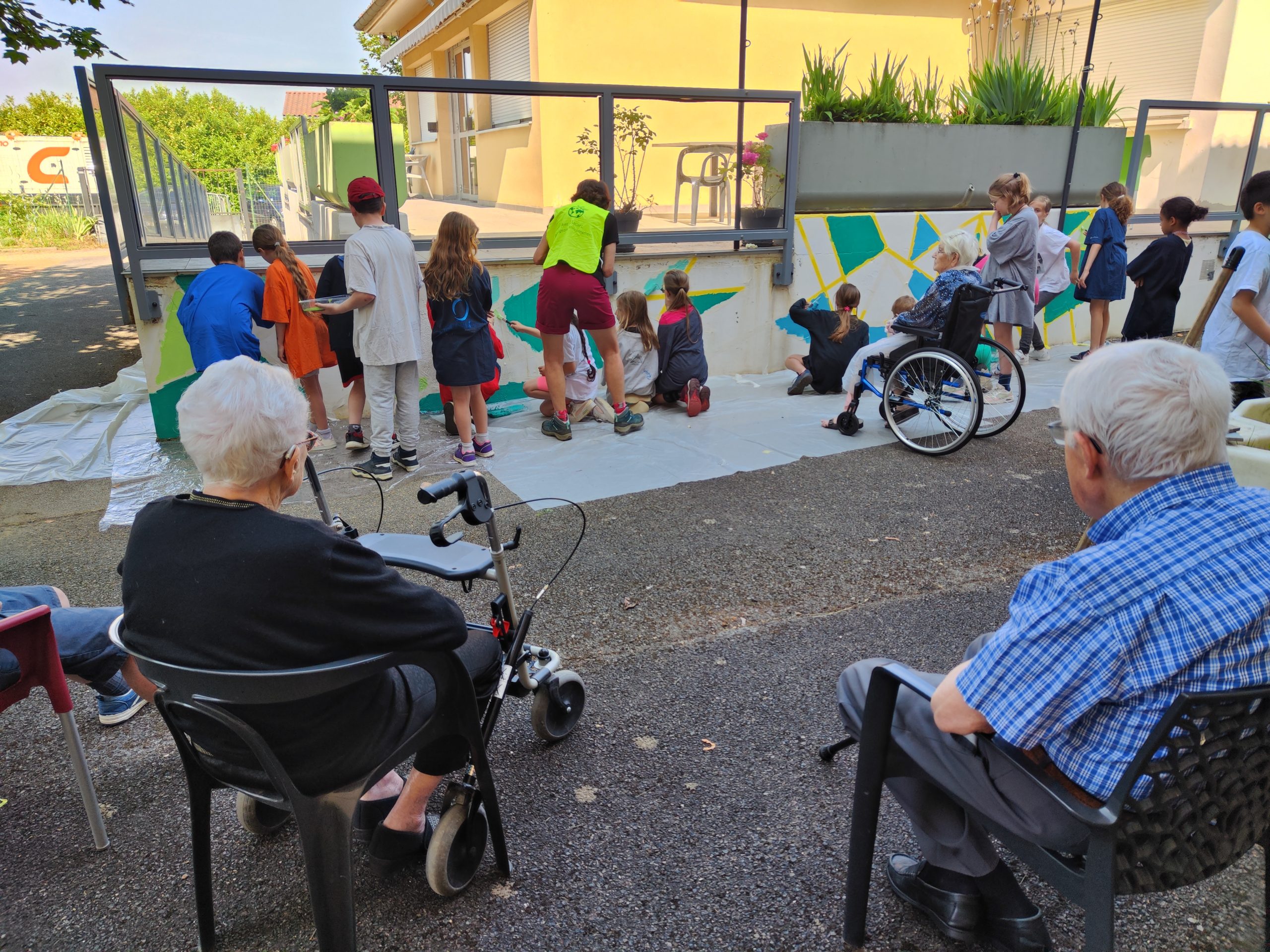 Grâce à l’initiative d’une famille de résident, nous avons collaboré avec l’école de Oingt sur un projet d’embellissement de notre jardin. Au programme, de la couleur et encore de la couleur. Une fresque, conçue et réalisée par les enfants et les résidents est désormais en place et apporte une mosaïque de couleurs sur un mur auparavant bien terne.